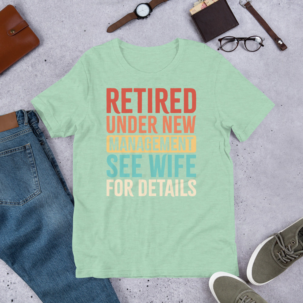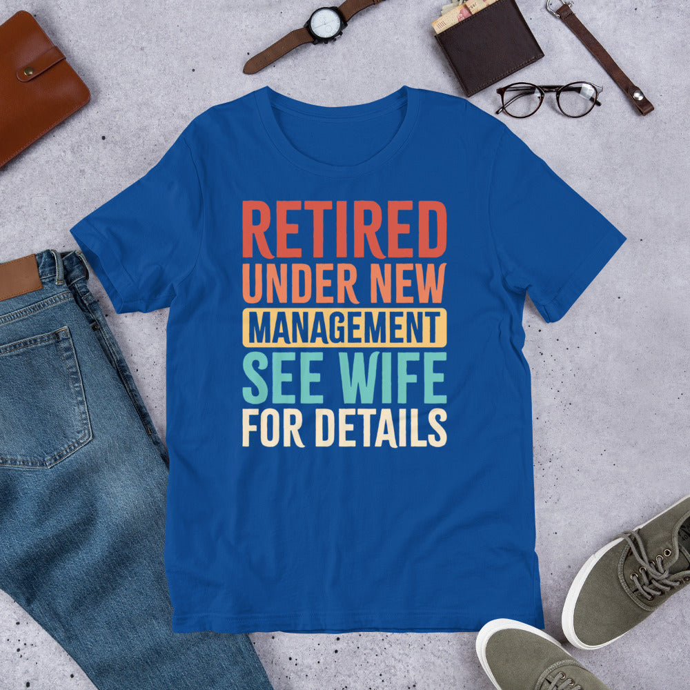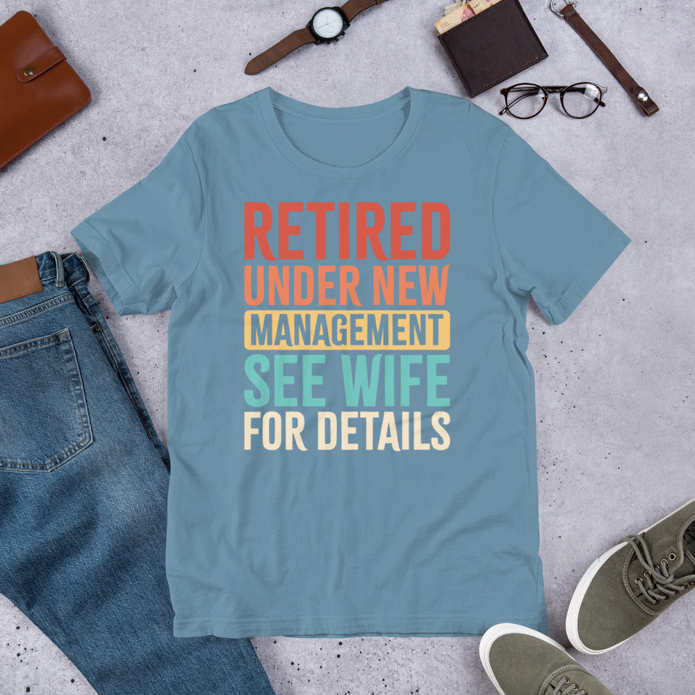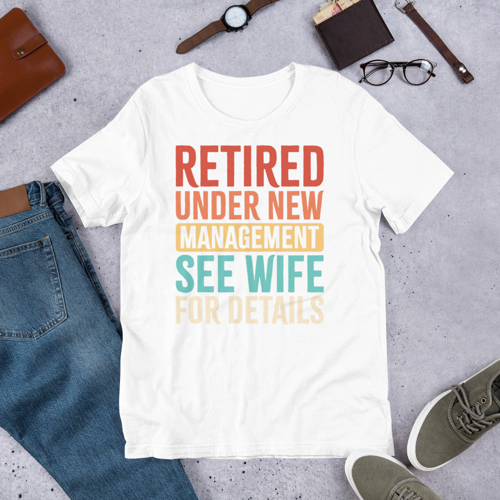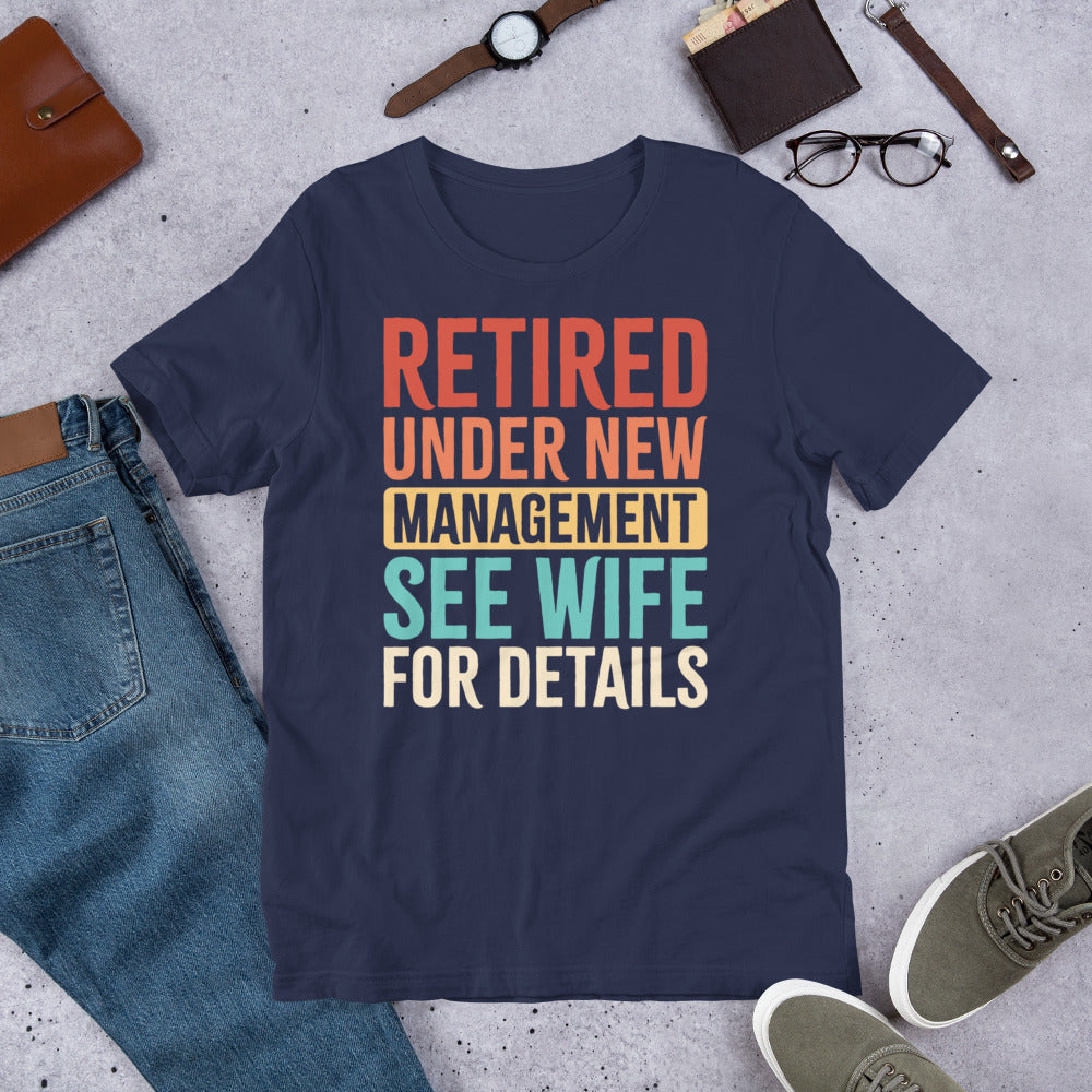 Retired Under New Management T-Shirt | Funny Retirement Gift | Husband Wife Tee | Senior Citizens | Pensioner Joke Shirt | Retiree Present