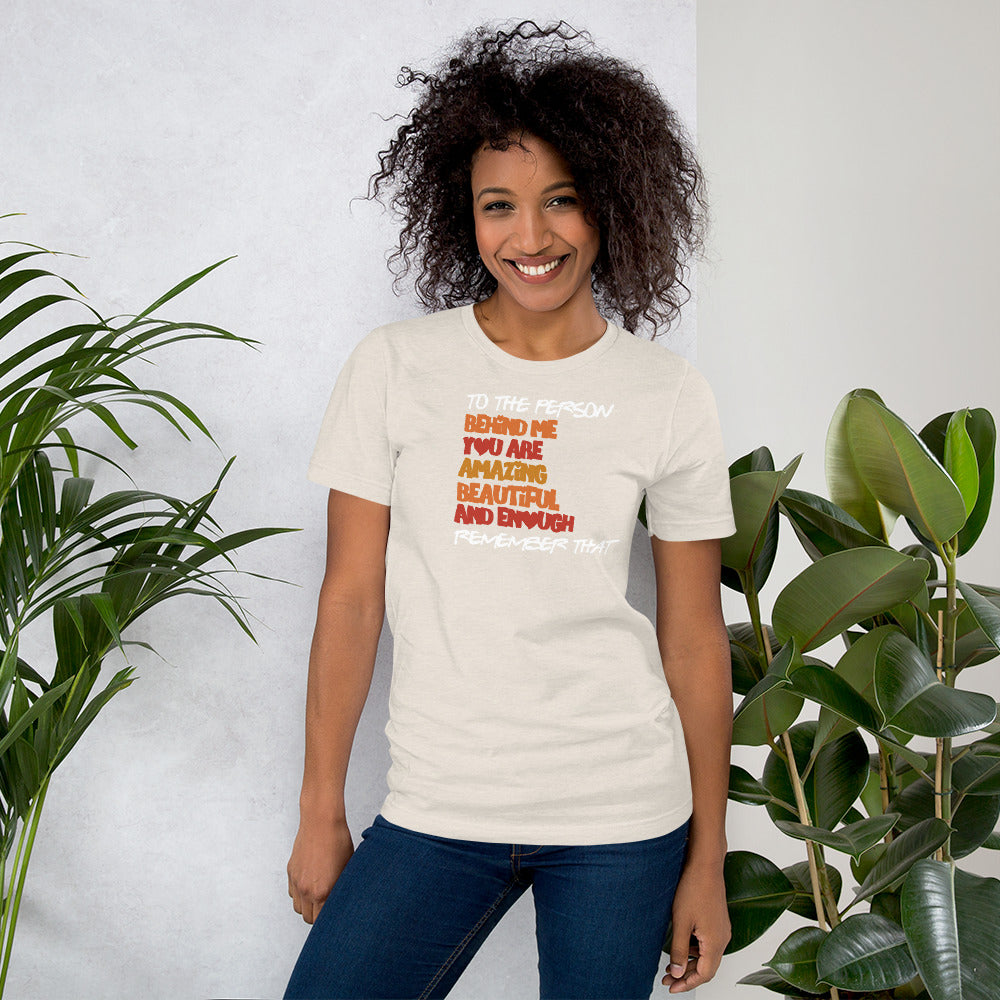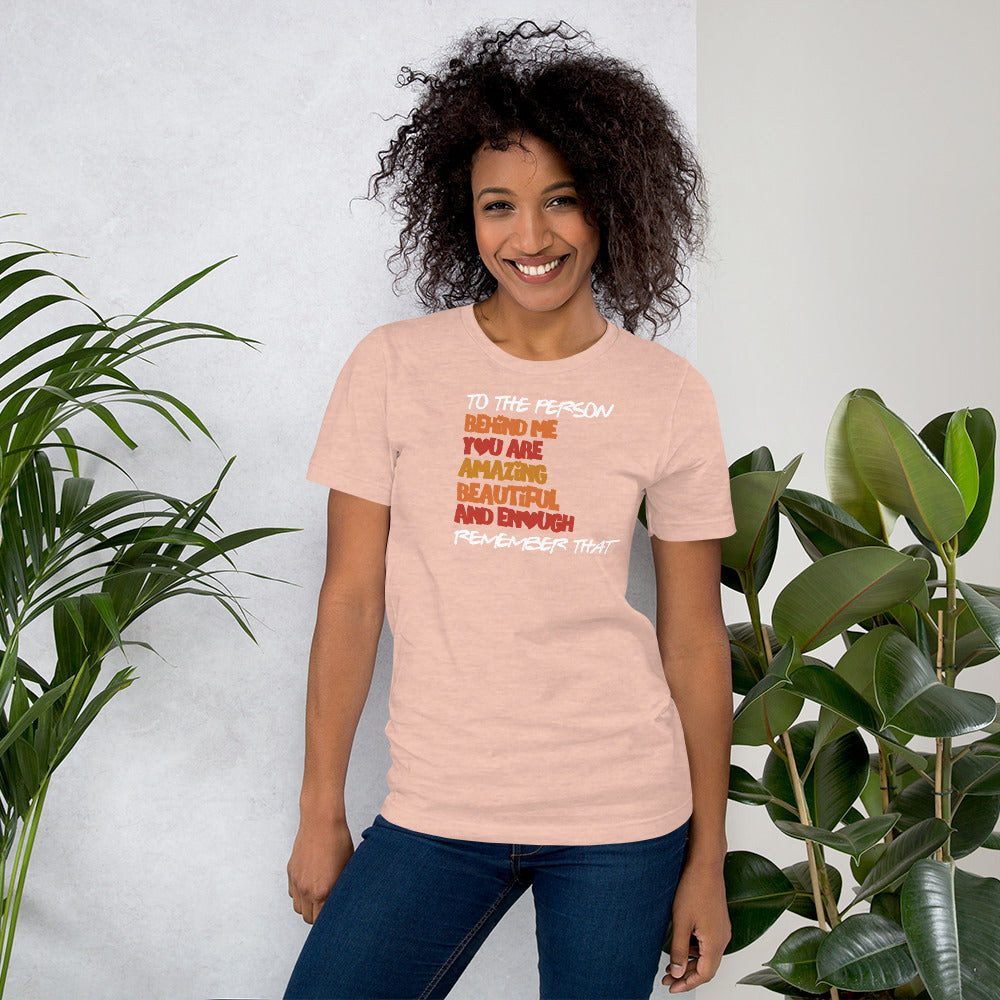 Spread positivity and encouragement wherever you go with this "To The Person Behind Me" t-shirt. Featuring the uplifting message, "You Are Amazing, Beautiful, and Enough," this tee is the perfect way to show your support for mental health awareness, body positivity, and self-love.