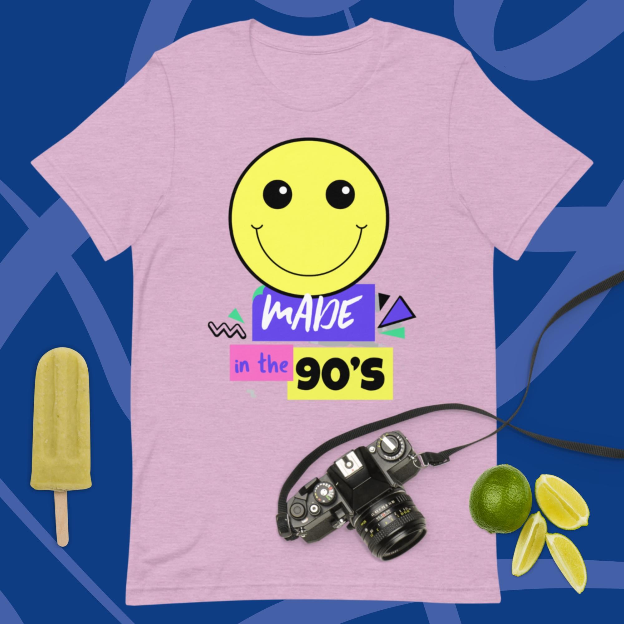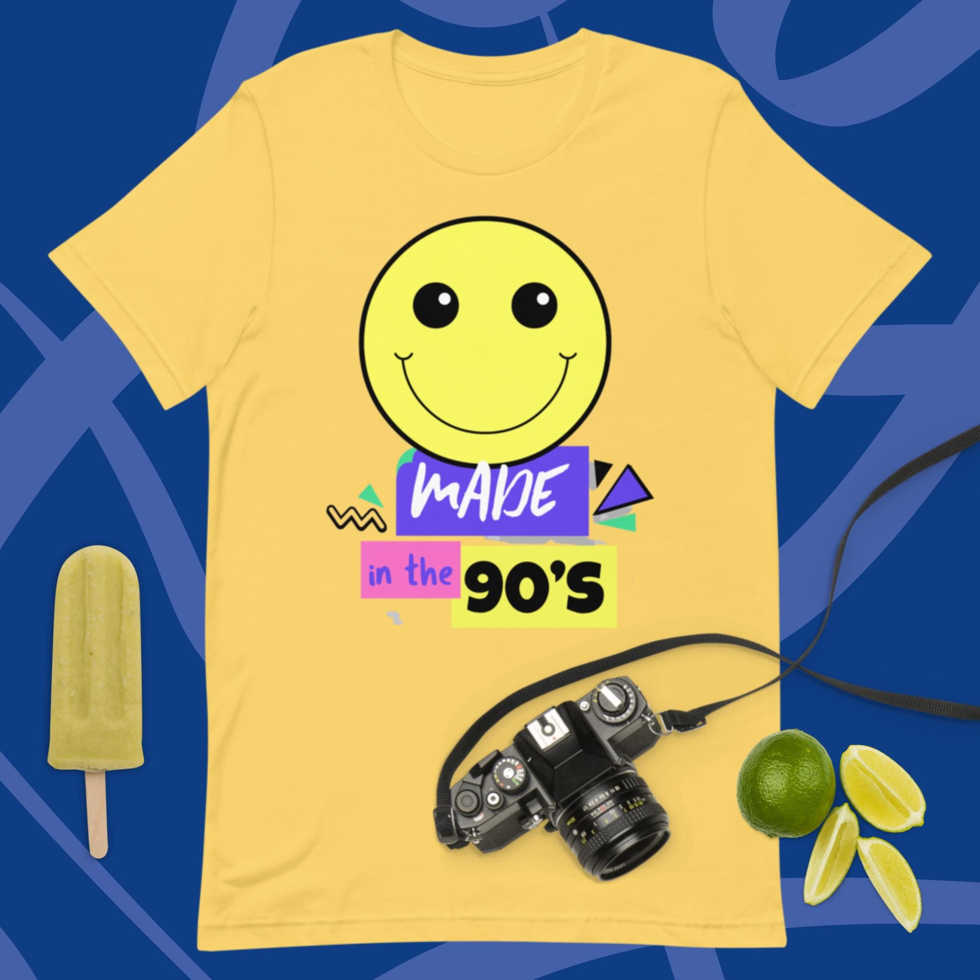 Introducing the "Made in the 90s" t-shirt! This fun and festive shirt is perfect for any 90s lovers out there who want to show their love for the decade. The shirt features a graphic of some of the most iconic images and symbols from the 1990s, including the famous smiley face , and of course the recognizable font from the decade. The shirt is made from a soft and comfortable fabric, and it's sure to be a hit with anyone who loved the 90s.