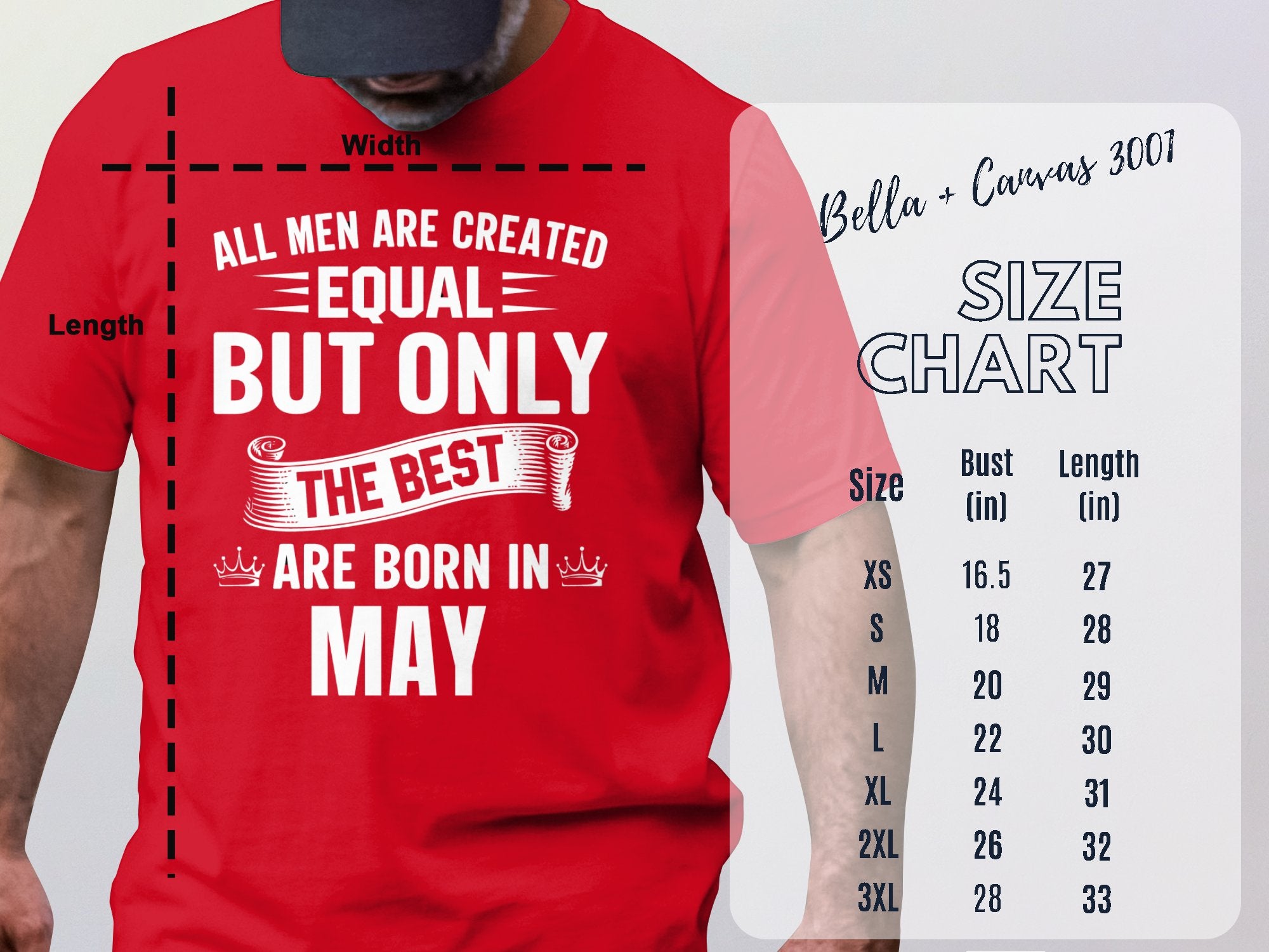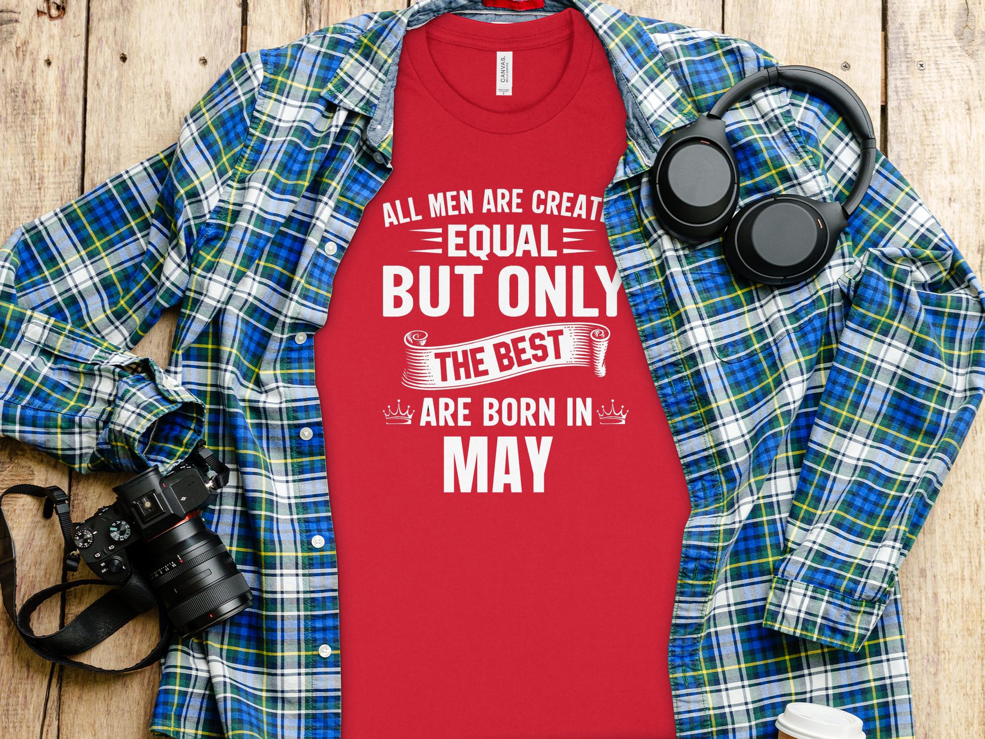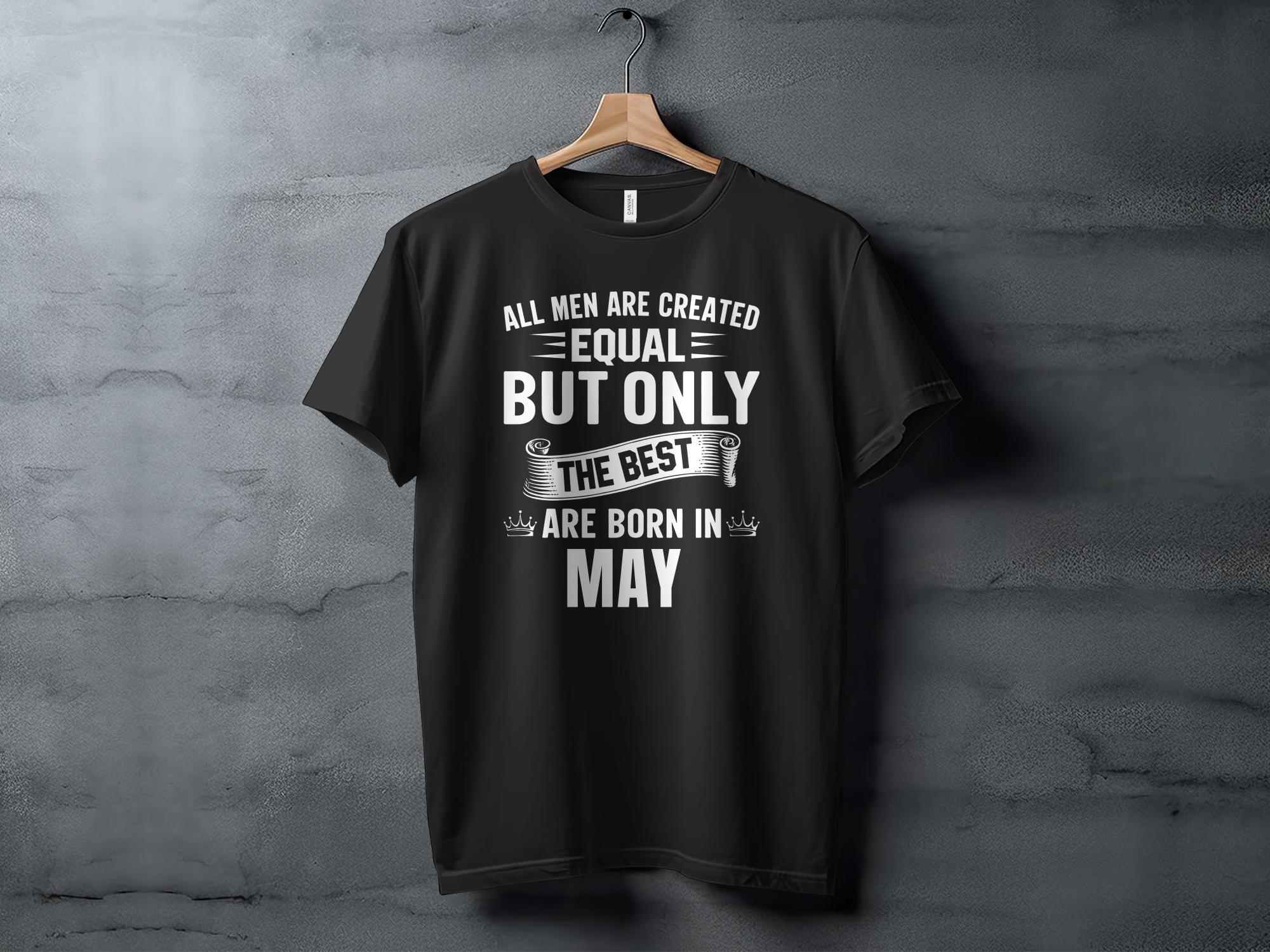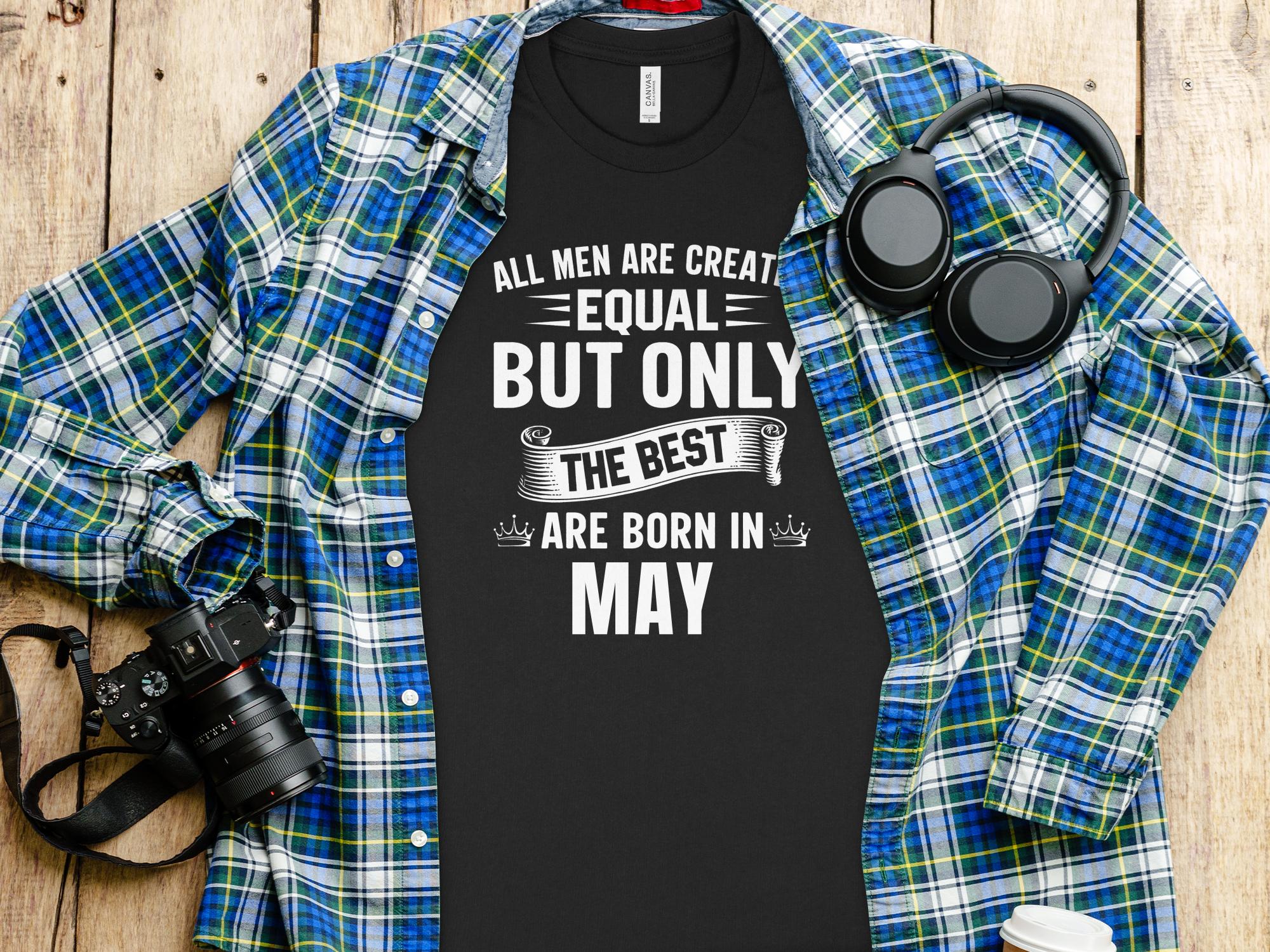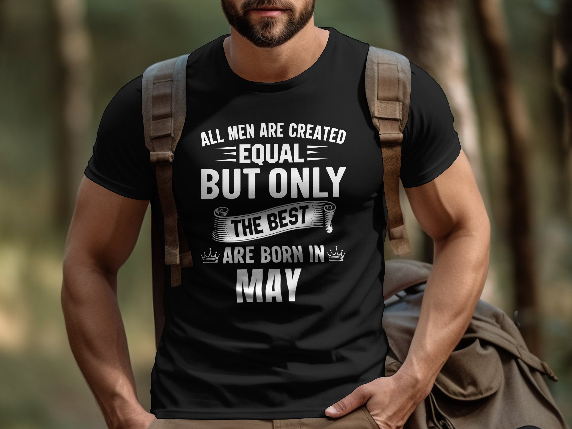 Celebrate a special May birthday with this bold and stylish men's T-shirt that makes a powerful statement: "All Men Are Created Equal But Only The Best Are Born in May." This comfortable and high-quality shirt is a perfect birthday gift, conversation starter, or addition to your casual wardrobe. The eye-catching design features a classic banner and crown motifs that make it ideal for May-born kings who want to stand out on their special day or any day of the year. Get it now to honor a friend, family member or treat yourself!