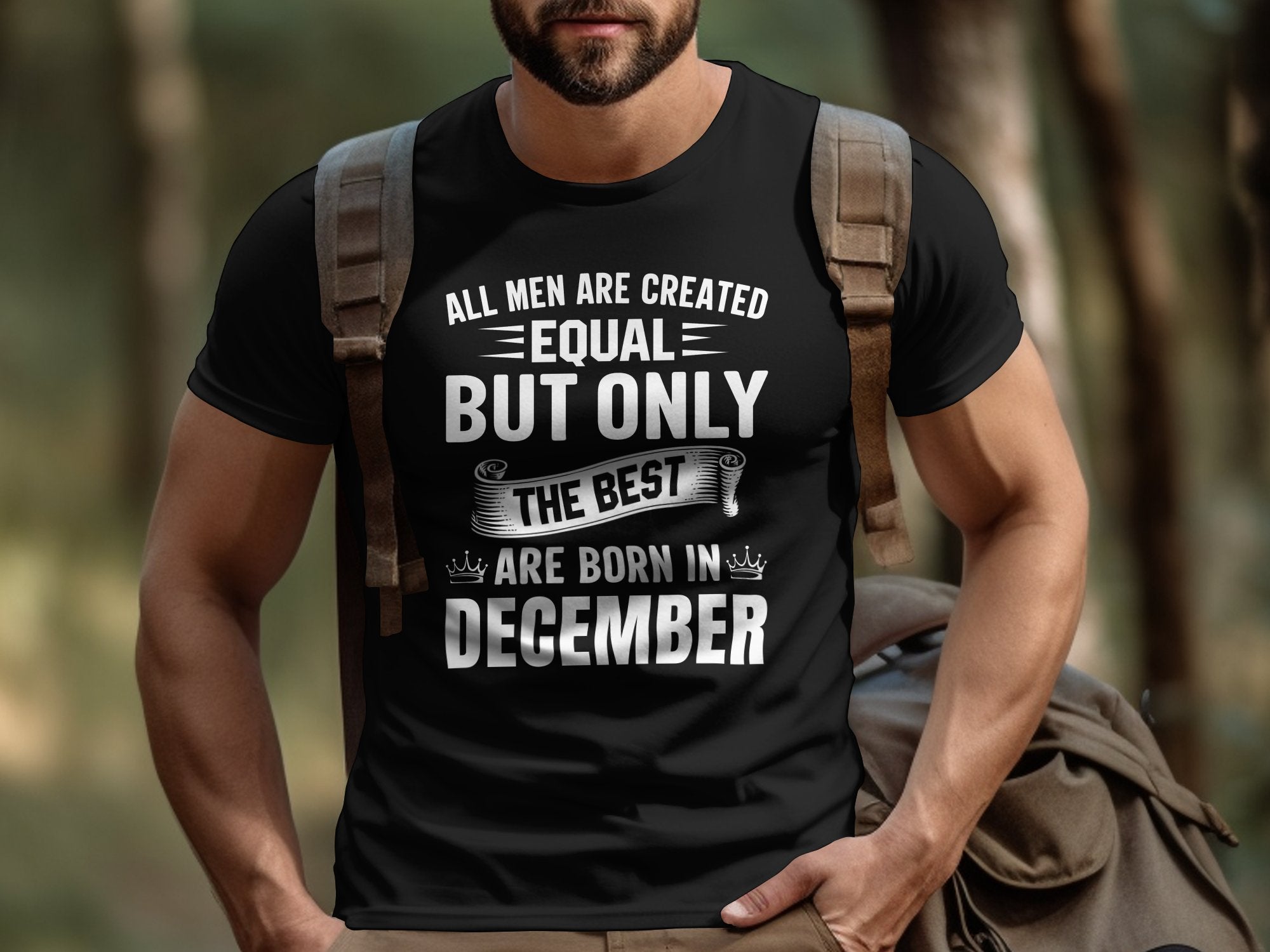 Celebrate the December born men in your life with this bold and stylish T-shirt that makes the perfect birthday gift. The shirt features a striking black and white design with the message "All Men are Created Equal but Only the Best Are Born in December", exuding confidence and pride for those special December birthdays. Ideal for casual outings, birthday parties, or as a standout piece in any wardrobe, this tee is made from comfortable materials and is sure to be a hit with those winter zodiac sign enthusiasts.