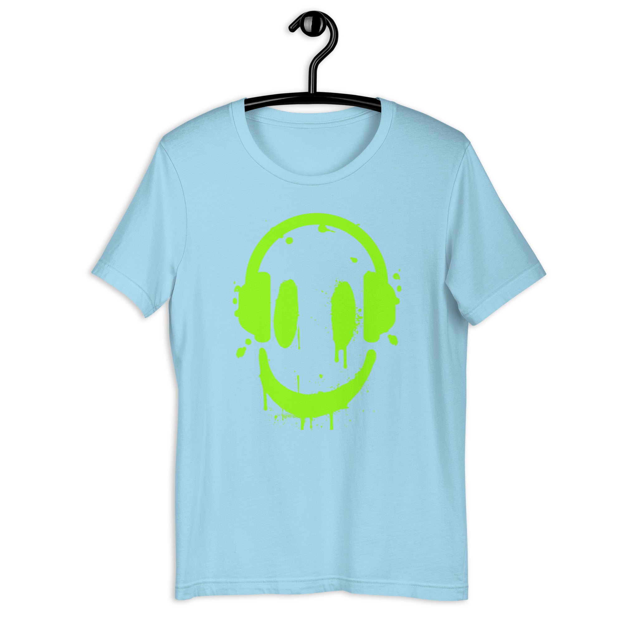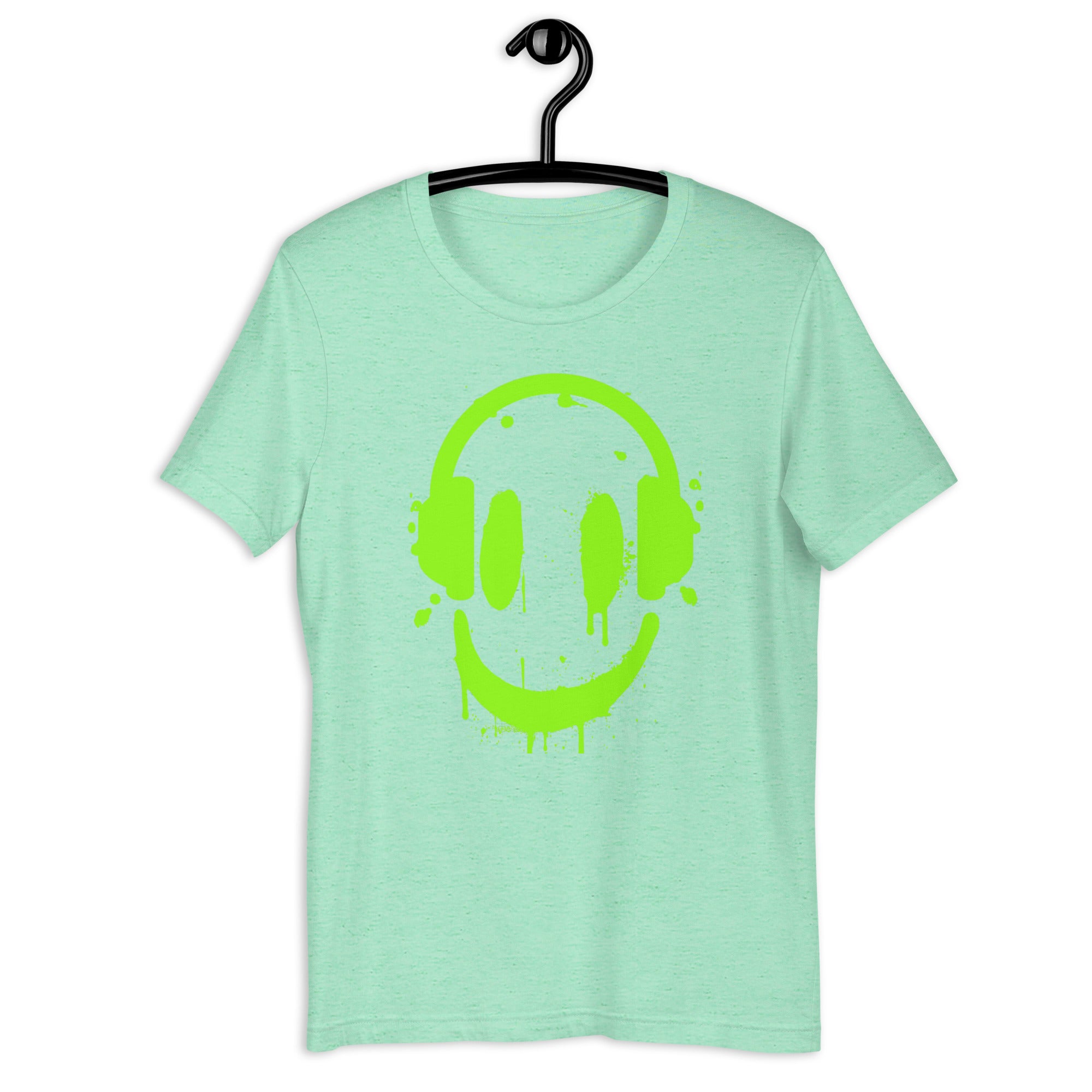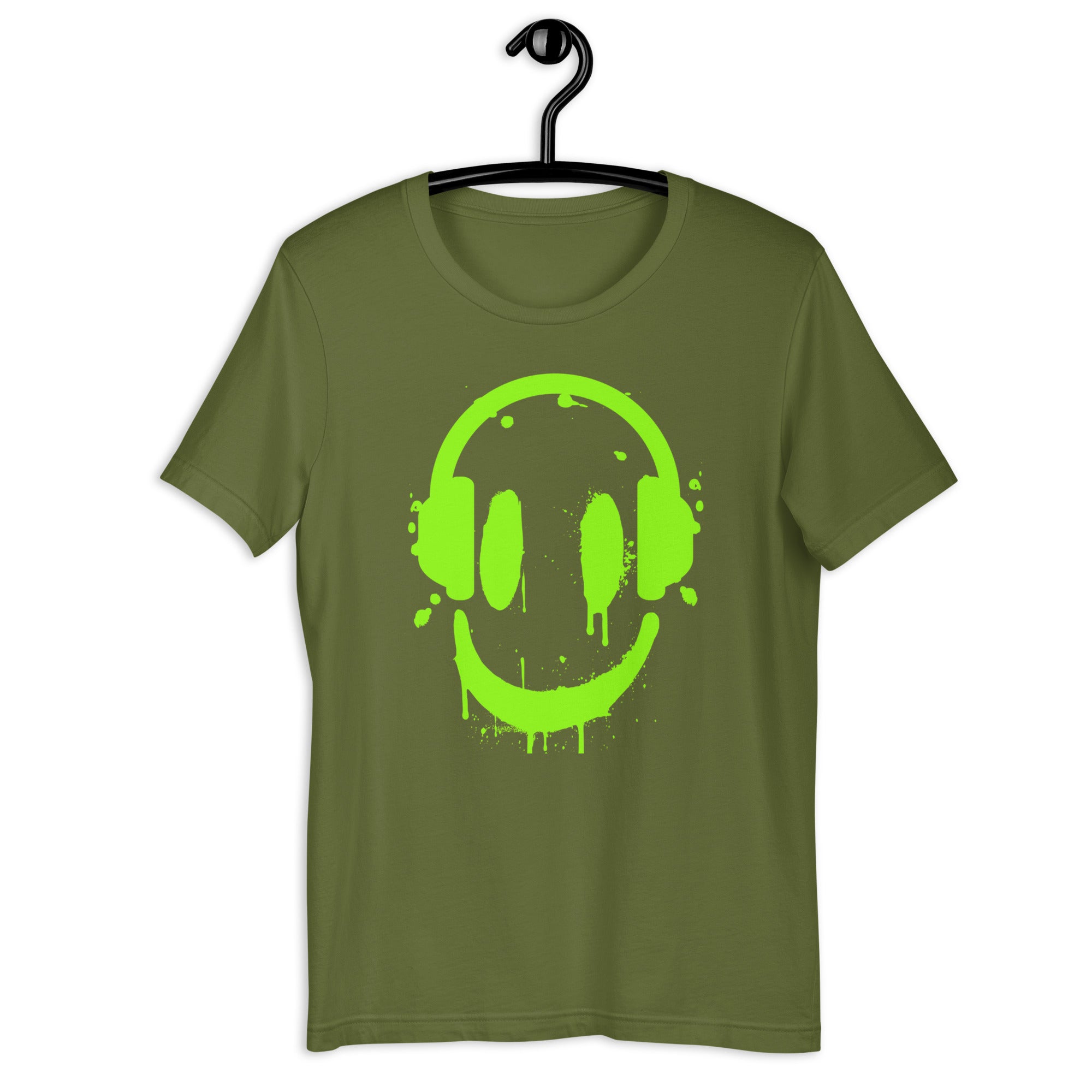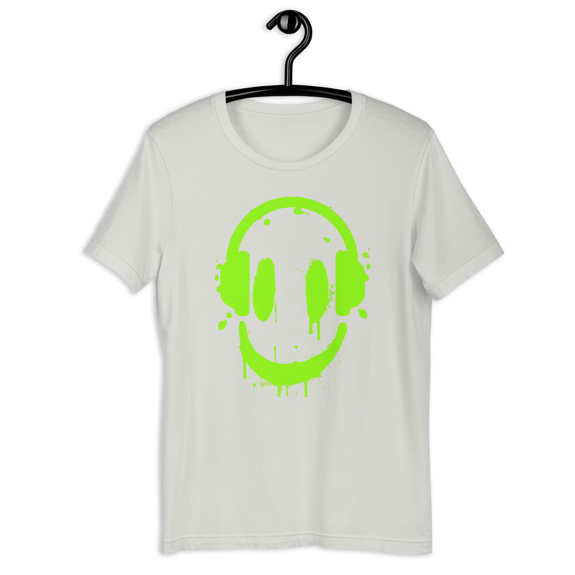 Get ready to stand out at your next rave, festival, or club night with this bold graffiti-style smiley face t-shirt featuring a neon spray-paint effect and headphones. Perfect for EDM lovers, techno fans, and streetwear enthusiasts, this eye-catching tee is a must-have for anyone who loves vibrant, high-energy fashion.