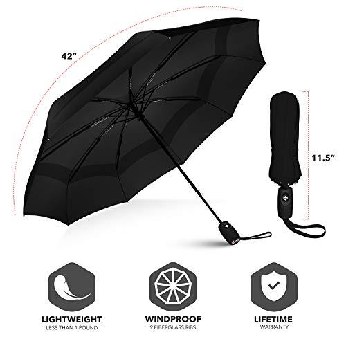 - AUTOMATIC, COMPACT, AND LIGHTWEIGHT - Auto open close function allows for easy one-handed operation. Measuring just 11.5" long and weighing less than 1lb the folding handheld umbrella is extremely packable in purses, briefcases, backpacks, luggage and more.